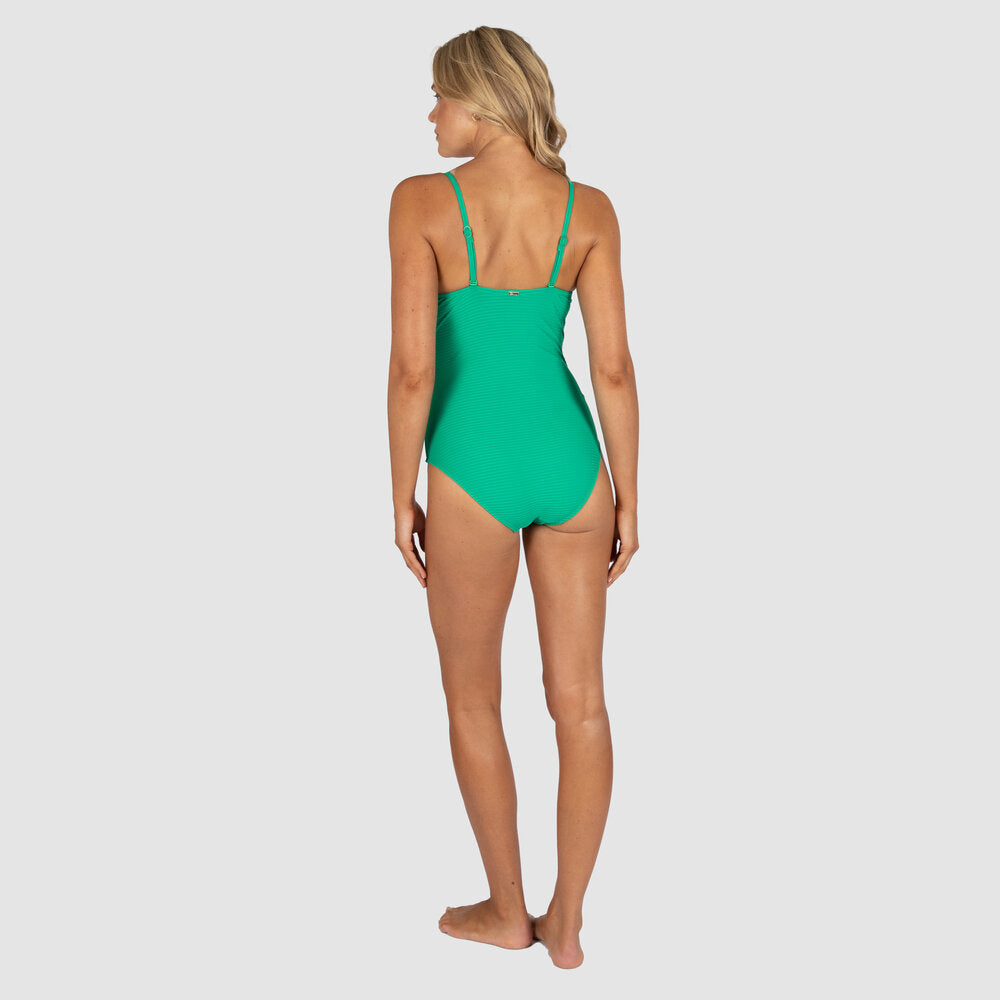 Baku's Positano Booster One Piece Swimsuit features a feminine ruffle edge detail, moulded underwire cups that provide shape and lift, inner removable padding for a versatile multi-cup fit, and adjustable convertible straps for a customized look and fit.
