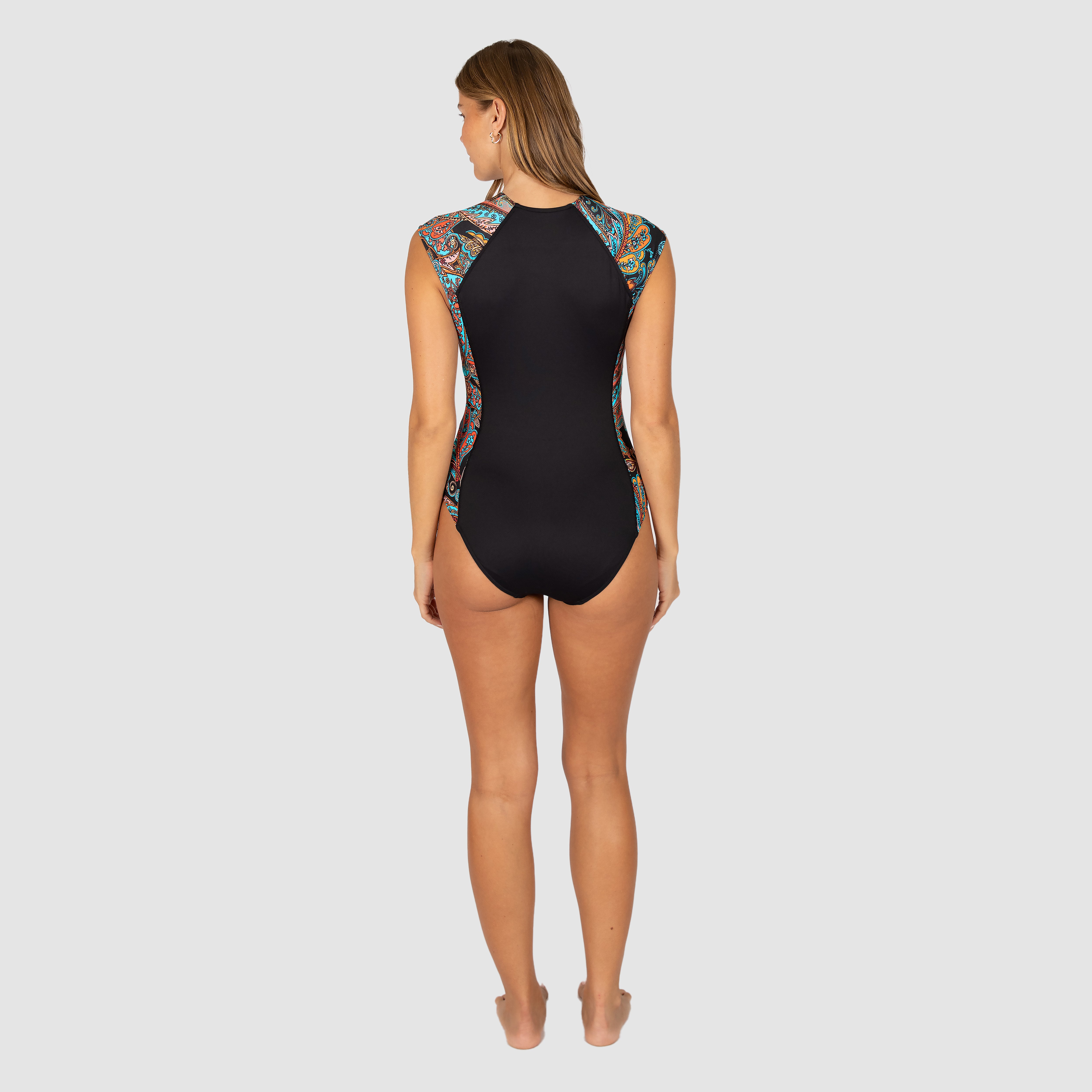 Baku's Sirenuse Cap Sleeve Surf Suit features a high neckline with contrasting panels. It also features a zip front, soft cups, is fully lined and has a UPF50+ rating.